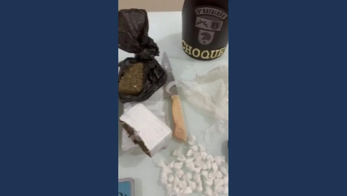 Durante buscas no veículo, os militares encontraram tabletes de maconha, além de porções de crack e haxixe. Em diligências paralelas, as equipes do Choque também apreenderam mais drogas na residência do suspeito, incluindo maconha, crack e cocaína, além de balanças de precisão e materiais usados no preparo das substâncias.
