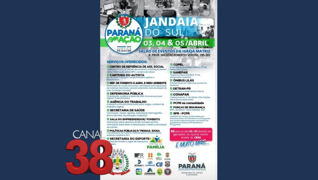 Durante os dias 3, 4 e 5 de abril, o município de Jandaia do Sul recebe o evento “Paraná em Ação”, promovido pelo Governo do Estado, com o intuito de oferecer diversos serviços gratuitos que promovem a cidadania e a inclusão social da população.