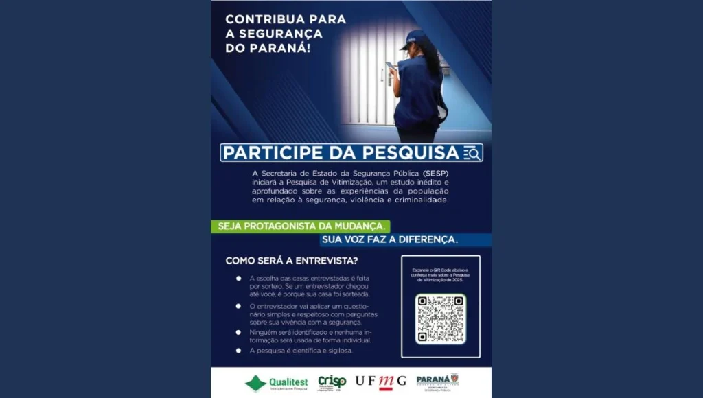 A Secretaria de Estado da Segurança Pública do Paraná (SESP) está realizando, desde 24 de julho de 2025, a Pesquisa de Vitimização da Segurança Pública, um estudo inédito e aprofundado para entender como a população paranaense percebe a violência, a criminalidade e a segurança em sua rotina.