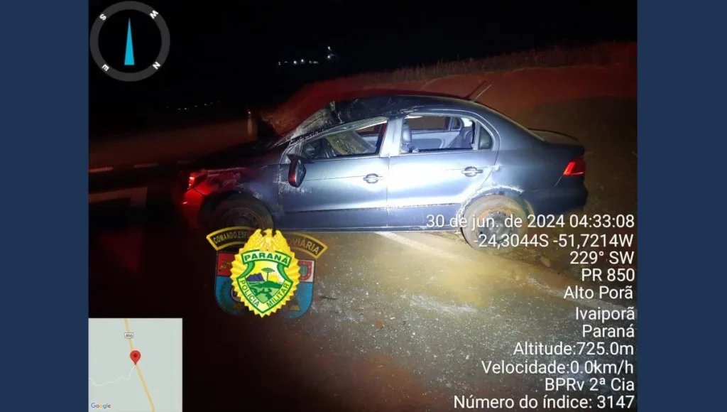 Na madrugada deste domingo (30), a Polícia Rodoviária Estadual (PRE) atendeu uma ocorrência de capotamento na rodovia PR 850, próximo ao Km 01, em Ivaiporã. O acidente aconteceu por volta das 3h e envolveu um veículo VW/VOYAGE com placas de Manoel Ribas.