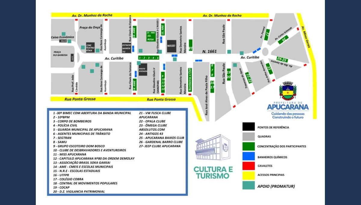 A Prefeitura de Apucarana, por meio da Secretaria Municipal de Segurança, Transporte, Trânsito, Mobilidade Urbana e Defesa Civil (Segtran) e da Secretaria Municipal de Cultura e Turismo, informa que diversas vias da região central da cidade serão interditadas no próximo domingo, dia 7 de setembro, devido à realização do tradicional Desfile da Independência. As interdições terão início às 6 horas da manhã e são necessárias para assegurar a organização do evento e a segurança dos participantes e da população.