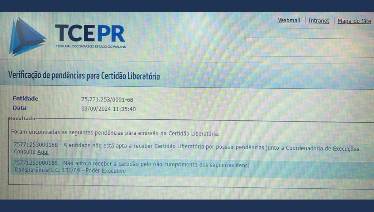 A Prefeitura de Apucarana encontra-se sem a Certidão Liberatória do Tribunal de Contas do Estado do Paraná (TCE/PR), o que impede o município de receber repasses de recursos e realizar transferências voluntárias. A ausência deste documento essencial reflete a existência de pendências junto ao TCE, comprometendo a capacidade da administração municipal de acessar recursos importantes para o desenvolvimento e manutenção de serviços públicos.