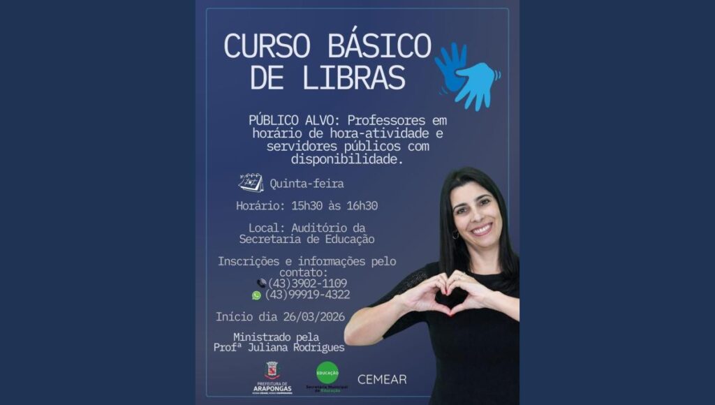 A Prefeitura de Arapongas, por meio da Secretaria Municipal de Educação, convida professores e servidores públicos para participarem do Curso Básico de Língua Brasileira de Sinais (LIBRAS). As inscrições podem ser feitas pelo link: https://docs.google.com/forms/d/e/1FAIpQLSfb0C50FwZC22mkSL4oqn86rt6uUJBOi8PbJe8BcODpompX-g/viewform?usp=publish-editor.