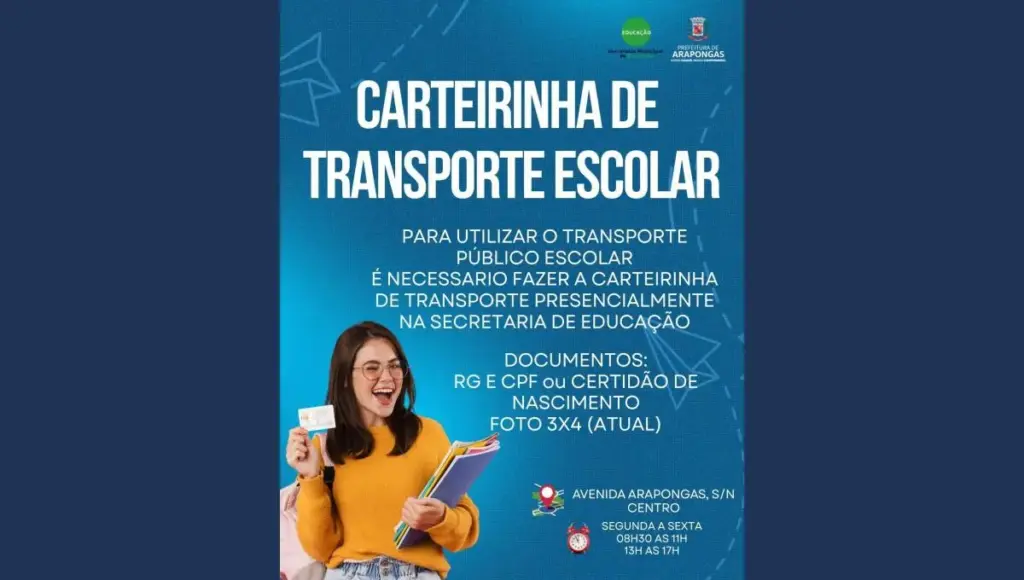 A Prefeitura de Arapongas, por meio da Secretaria de Educação, informa aos pais e responsáveis pelos alunos da rede municipal e estadual de ensino, que é obrigatória a confecção da carteirinha para que os estudantes possam utilizar o transporte público escolar.