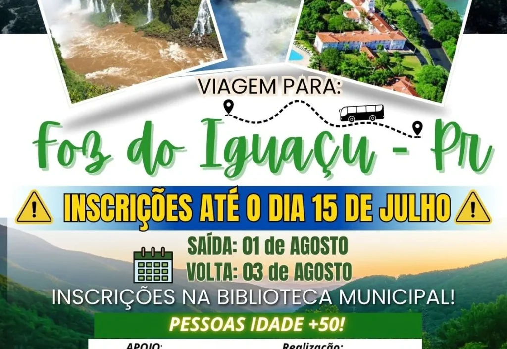 A Prefeitura de Rio Bom, por meio da Secretaria Municipal de Esporte, Cultura, Turismo e Lazer, informa que estão abertas as inscrições para uma viagem especial a Foz do Iguaçu, voltada a moradores com 50 anos ou mais. A iniciativa faz parte de um projeto de valorização da terceira idade e promoção do turismo social, em parceria com o Governo do Estado do Paraná e a Secretaria Estadual do Turismo.