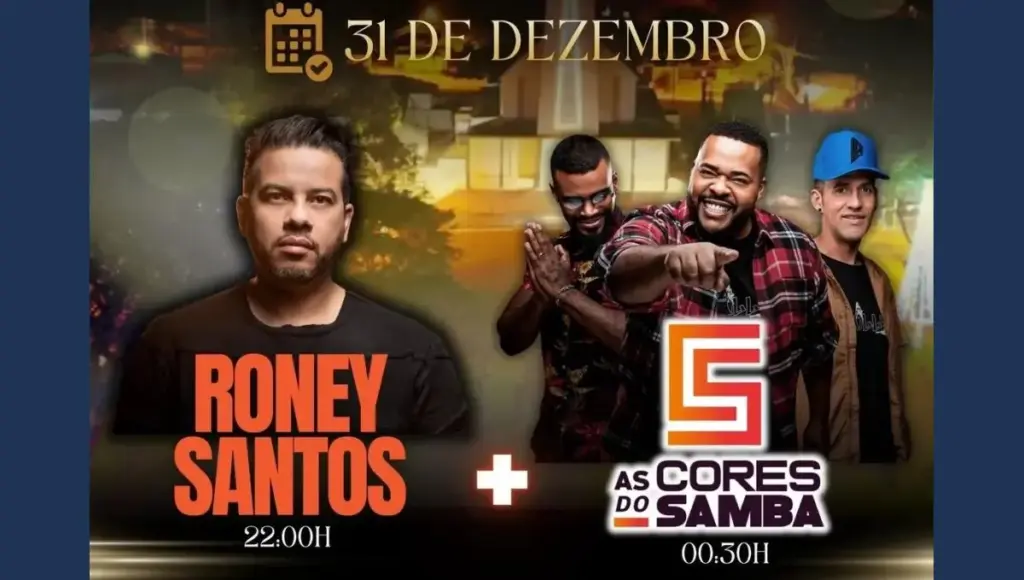 A programação terá início às 22h, com o cantor Roney Santos, trazendo um repertório animado para embalar o público e marcar os momentos que antecedem a virada do ano. Já à 0h30, a festa continua com o show da banda As Cores do Samba, garantindo muito ritmo, animação e celebração para começar o novo ano em grande estilo.