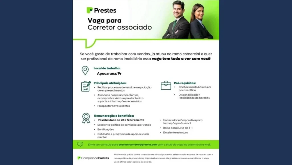 A Prestes Construtora está com uma excelente oportunidade para quem deseja ingressar no mercado imobiliário. A empresa está contratando profissionais para atuar como corretor associado na cidade de Apucarana, e o melhor: não é preciso ter experiência anterior na área.