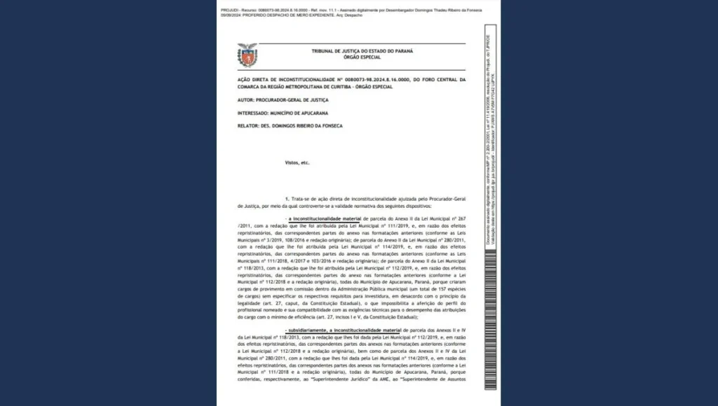 O Desembargador Domingos Ribeiro da Fonseca, relator do processo no Órgão Especial do TJPR, determinou na segunda-feira, 9 de setembro de 2024, a intimação do prefeito e da Câmara Municipal de Apucarana para que se manifestem formalmente sobre a ação.