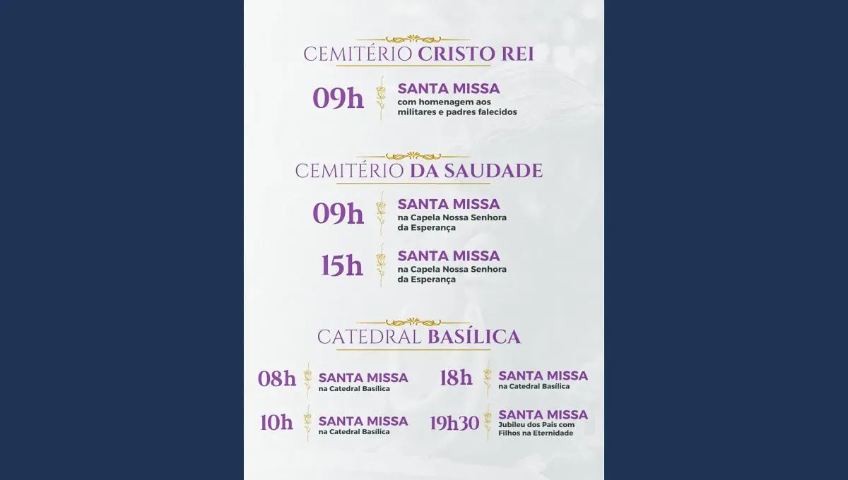 Já na Catedral Basílica, as missas acontecerão às 8h, 10h, 18h e às 19h30, esta última dedicada ao Jubileu dos Pais com Filhos na Eternidade.