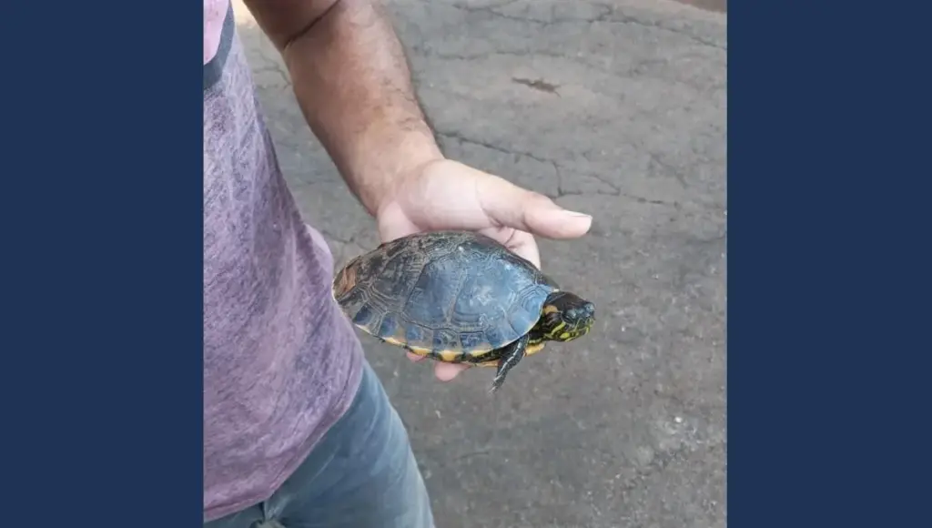 Durante a abordagem a um veículo, os agentes identificaram um quelônio da espécie Tigre-d’Água, cuja retirada do ambiente natural foi confirmada. Diante da irregularidade, foi lavrado Auto de Infração Ambiental contra a responsável legal, com aplicação de multa no valor superior a R$ 3.591,90.
