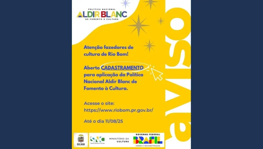 Segundo a Secretaria Municipal de Cultura, o cadastramento é uma etapa fundamental para que Rio Bom possa acessar os recursos da Política Nacional Aldir Blanc e garantir que o investimento chegue a quem realmente movimenta e fortalece a cultura local.