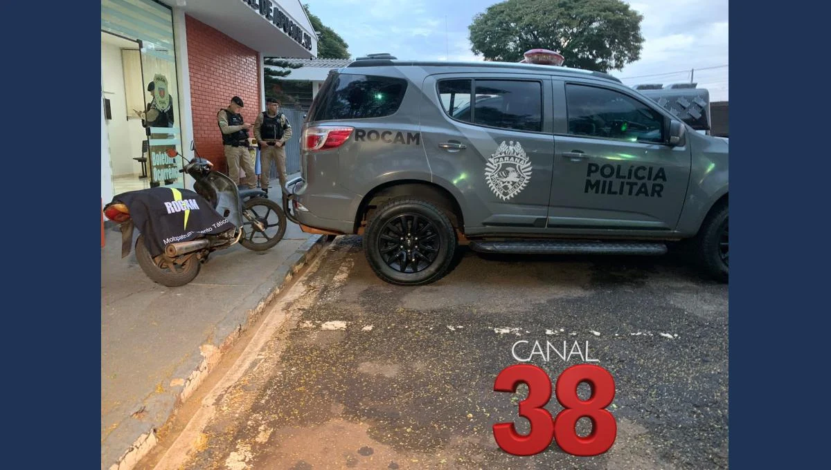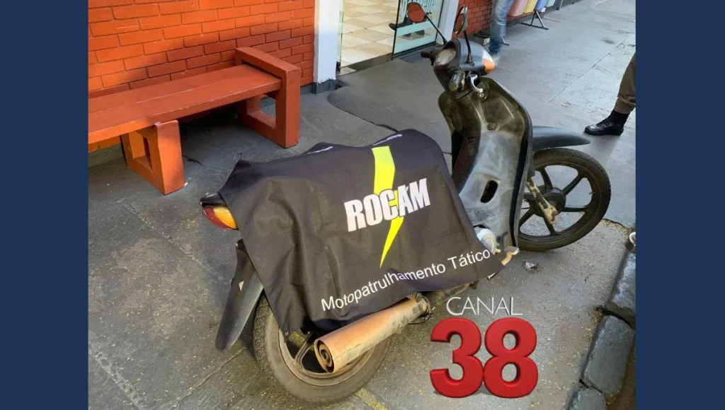 A motoneta, uma Honda C100 Biz de cor preta, estava estacionada em frente a um estabelecimento comercial e chamou atenção dos policiais pelo seu estado de conservação. Ao se aproximarem, os agentes perceberam que o veículo havia sido pintado, mas ainda era possível identificar que sua cor original era azul.