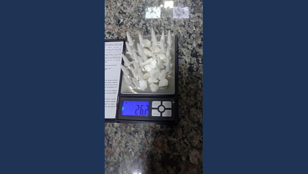 Ainda durante o trabalho do cão farejador, no quintal da residência, próximo à janela da cozinha, foi encontrado um pote plástico contendo grande quantidade de cocaína. No interior havia 26 porções acondicionadas em eppendorfs e outras 13 embaladas em plástico, totalizando 39 porções da substância.