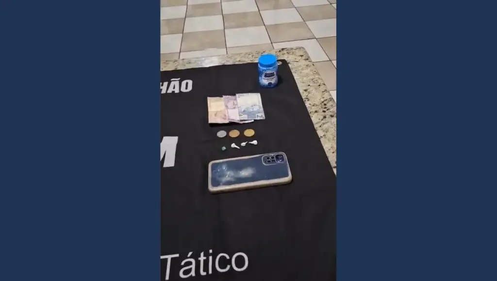 “O masculino foi abordado e, em sua mão, encontramos uma porção de substância análoga ao crack. De imediato, entramos na residência atrás das duas suspeitas. Uma delas estava com uma criança de dois anos no colo. Após a abordagem, ela mesma retirou de dentro do sutiã um pote plástico contendo três porções de crack idênticas à encontrada com o homem”, relatou o cabo.
