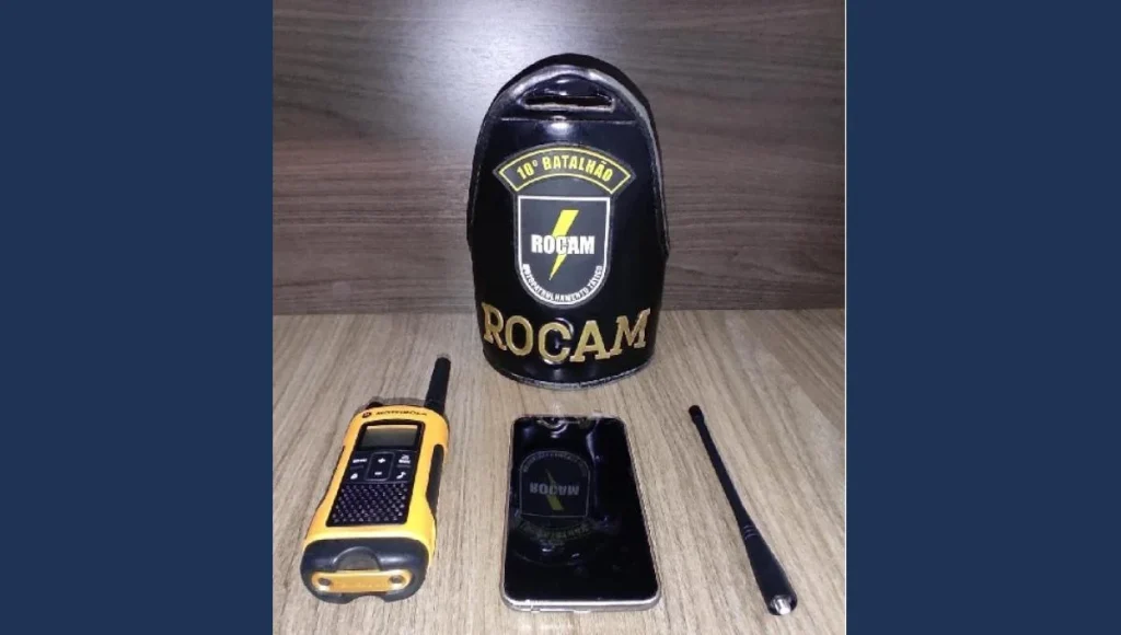 A equipe da ROCAM, informando o proprietário sobre o uso do veículo no crime, solicitou autorização para verificar se havia pertences das vítimas no interior da residência. O proprietário consentiu e, durante a busca, nada foi encontrado dentro da casa. No entanto, ao revistar o veículo, a equipe localizou um rádio comunicador amarelo da marca Motorola e um celular LG, que estavam dentro de uma sacola.