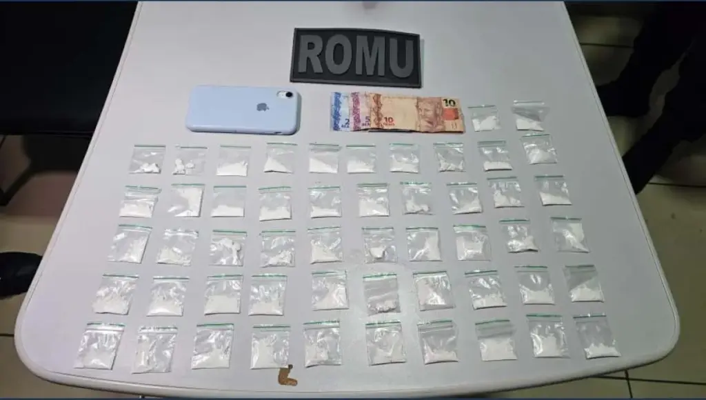 Ao perceber a aproximação da viatura, o motociclista dispensou um objeto e continuou trafegando. Poucos metros adiante, ele foi abordado. Com ele, foram encontrados apenas um celular e R$ 17. A equipe retornou ao ponto onde algo havia sido jogado e localizou um pacote contendo 52 porções de cocaína, já fracionadas e prontas para comercialização no conhecido “disque-drogas”. Conforme explicou o comandante, tratava-se de um “kit” praticamente completo, indicando que o suspeito provavelmente acabara de buscar o material.