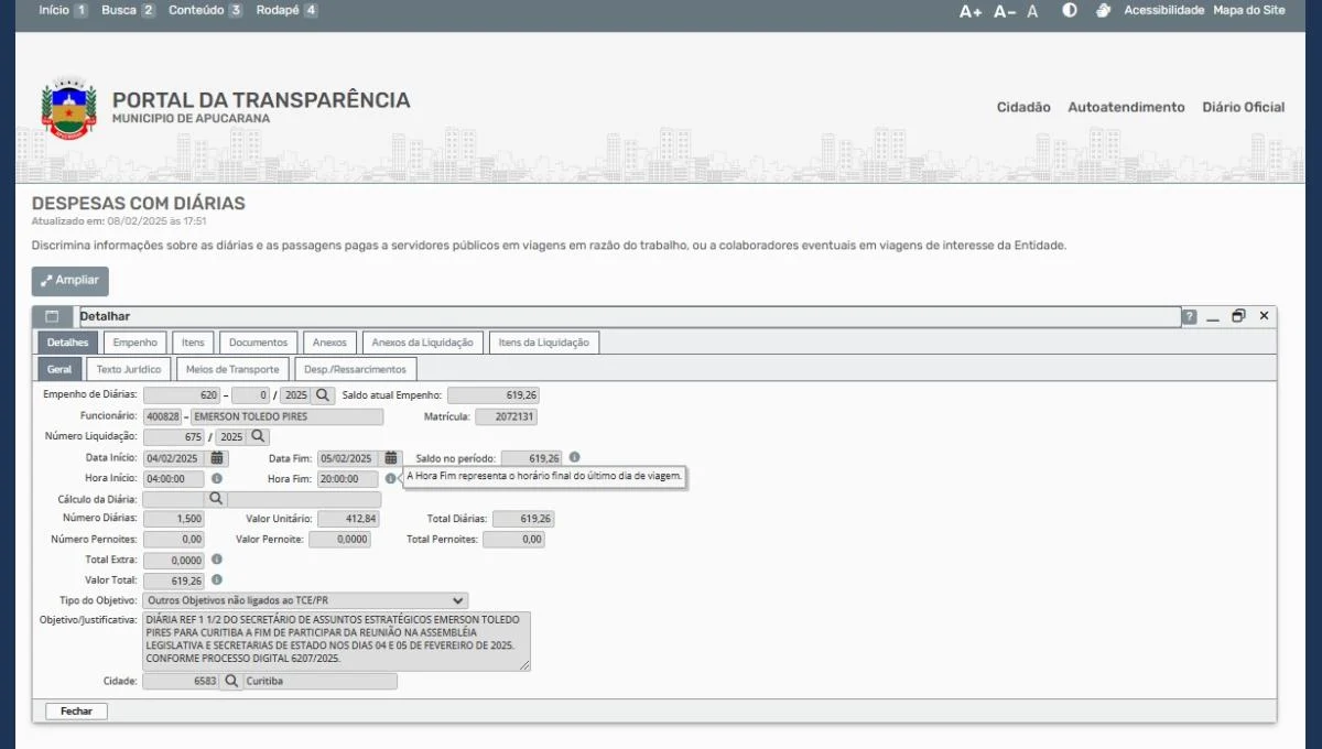 A pergunta que fica é simples: por que os contribuintes de Apucarana estão financiando agendas políticas de outro município? Se Emerson Toledo estava a serviço de Cambira, seria lógico que a Prefeitura de Cambira ou ele próprio arcassem com as despesas, e não a Prefeitura de Apucarana. A prática, além de antiética, pode configurar desvio de finalidade de recursos públicos, um ato que merece investigação mais profunda.