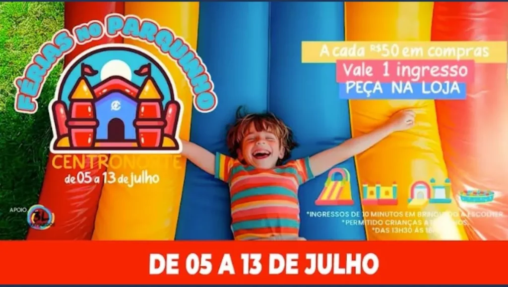 “Está começando hoje o nosso parquinho de férias do Shopping CentroNorte. Cada compra que você fizer, a cada R$50, você vai ganhar o cupom. Não é compre e concorra, você compra e ganha o cupom para vir e poder desfrutar 10 minutos de um brinquedo aqui no estacionamento externo”, explica.
