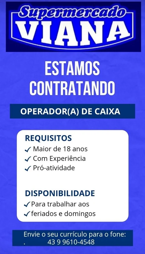 O Supermercado Viana, um dos estabelecimentos mais tradicionais de Apucarana, está com vagas abertas para o cargo de Operador(a) de Caixa. A empresa busca candidatos comprometidos e dinâmicos para integrar sua equipe e contribuir com o atendimento de qualidade que é marca registrada do supermercado.