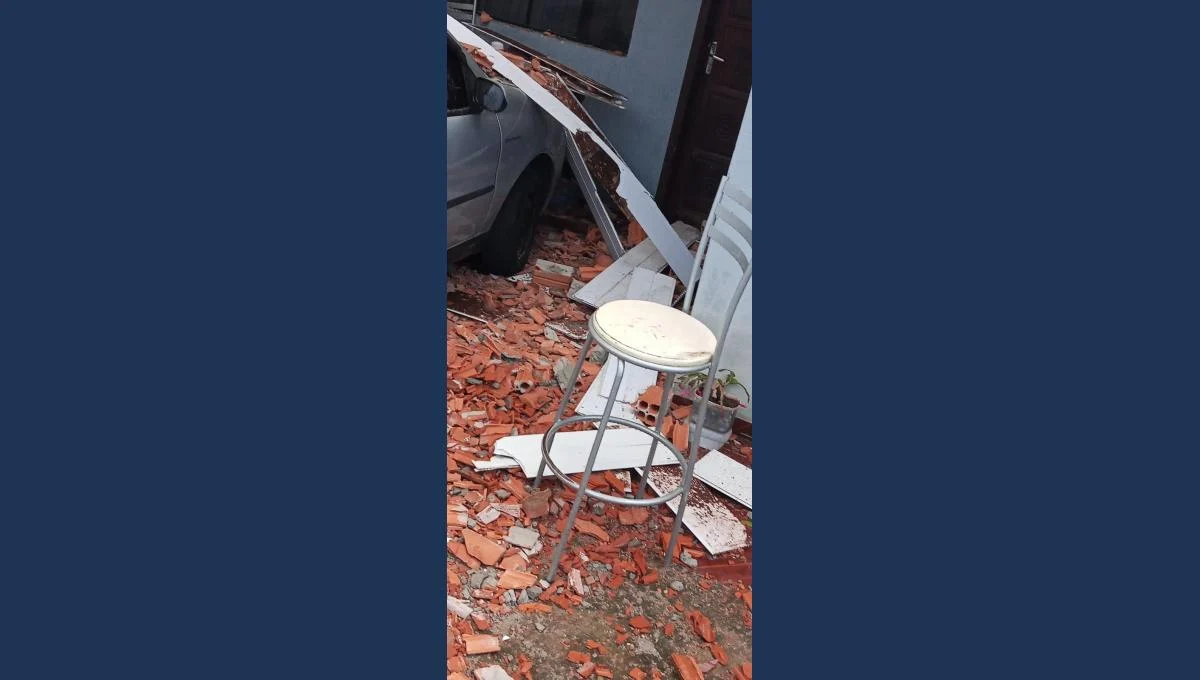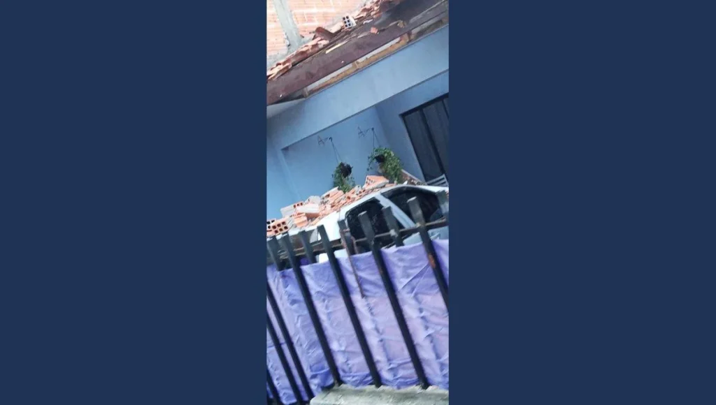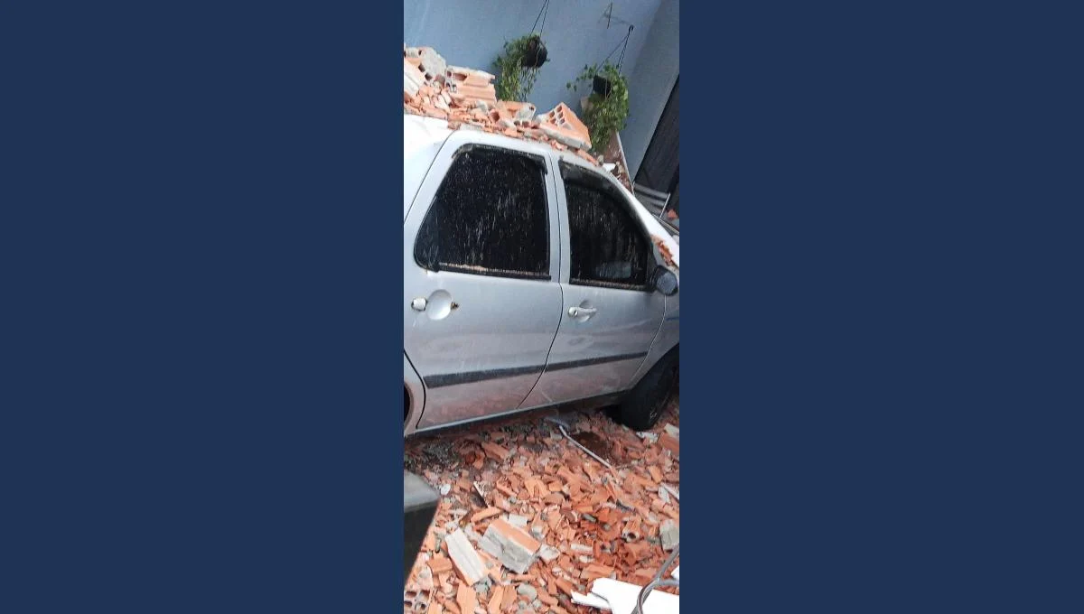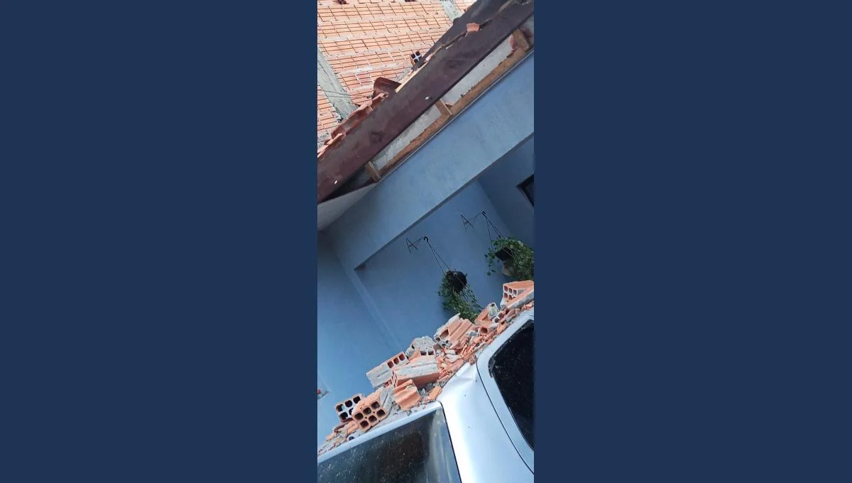 De acordo com informações dos moradores, parte das telhas caiu sobre um veículo que estava estacionado na garagem da casa, causando danos visíveis no automóvel. Ninguém ficou ferido.