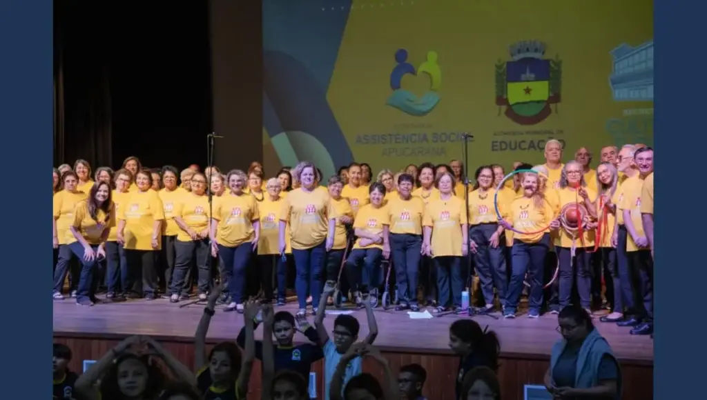 Projeto Vozes, de Londrina, com mais de 100 vozes da terceira idade leva música, arte e emoção a uma plateia formada por idosos do Centro Dia e alunos da rede municipal de ensino de Apucarana