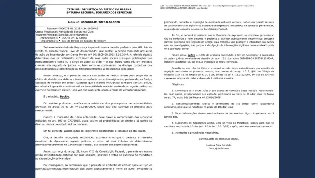 O Tribunal de Justiça do Estado do Paraná (TJPR), por meio da 5ª Turma Recursal dos Juizados Especiais, concedeu medida liminar no Mandado de Segurança impetrado pelo vereador Lucas Ortiz Leugi, de Apucarana, contra decisão do Juizado Especial Cível local que havia determinado a remoção de publicações de suas redes sociais e a proibição de novas manifestações envolvendo o nome de um servidor público municipal investigado em processo sob segredo de justiça.