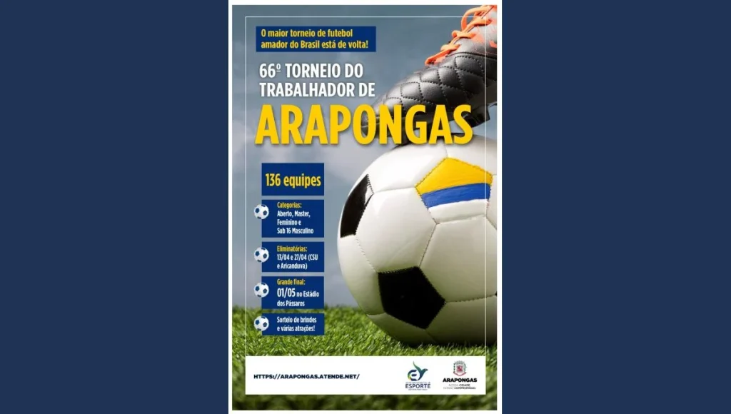 Arapongas se prepara para sediar mais uma edição histórica do tradicional Torneio do Trabalhador. Considerado o maior torneio de futebol amador do Brasil, o evento chega à sua 66ª edição em 2025 reunindo 136 equipes distribuídas nas categorias Aberto, Master, Feminino e Sub-16 Masculino.