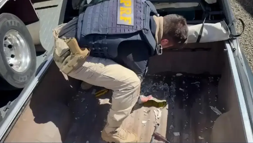 Por volta das 9h30, os policiais abordaram o veículo e perceberam alterações estruturais e forte odor de massa plástica. A equipe aprofundou a vistoria e localizou o compartimento falso. Dentro dele foram encontrados 40,27 quilos de maconha, 535 gramas de haxixe e 315 gramas de cocaína.