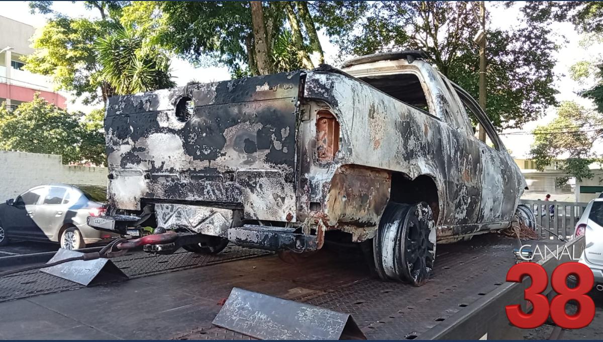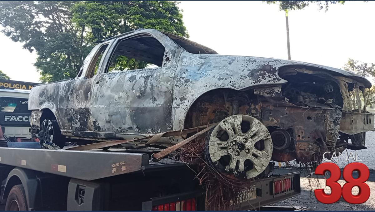Os policiais se deslocaram até o endereço indicado e, após adentrarem por uma pequena trilha próxima à área de mata, localizaram um veículo Fiat Strada Trek CE Flex completamente incendiado.