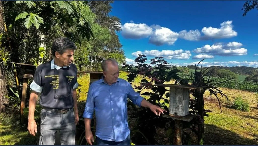 Na última quarta-feira (30), o vereador Luiz Vilas Boas (PDT) realizou uma visita técnica à propriedade rural de Ademir Maldonado, referência na criação de abelhas nativas sem ferrão em Apucarana. O objetivo da visita foi conhecer de perto o trabalho desenvolvido na área da meliponicultura, prática que alia conservação ambiental, polinização de espécies nativas e produção sustentável de mel. O vereador foi acompanhado de Maurício Gregório, presidente da Associação de Meliponicultura e Apicultura de Apucarana (AAMELIPO).